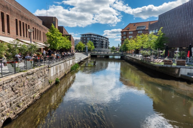 Hovedindgangen findes i den sydvendte trappeomgang mod åen. Der er handicapindgang med elevator ved den vestvendte trappeomgang (ved bowlingcentret).